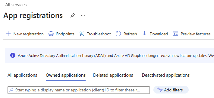 3. Click App registrations. You should be presented with a screen similar to the one below.