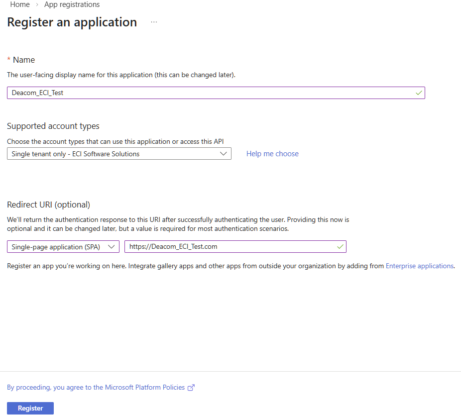 3. In the Redirect URL section* - select Single-page application (SPA) and then next add the URL/link of the Deacom system you are using. For customers, this will be their test and/or production systems. Example syntax: https://yourcompany.deacom.com