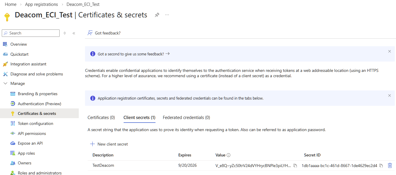 2. In the Entra/Azure admin center, on the left hand menu (under the Manage option/folder) click the Certificates & secrets option.