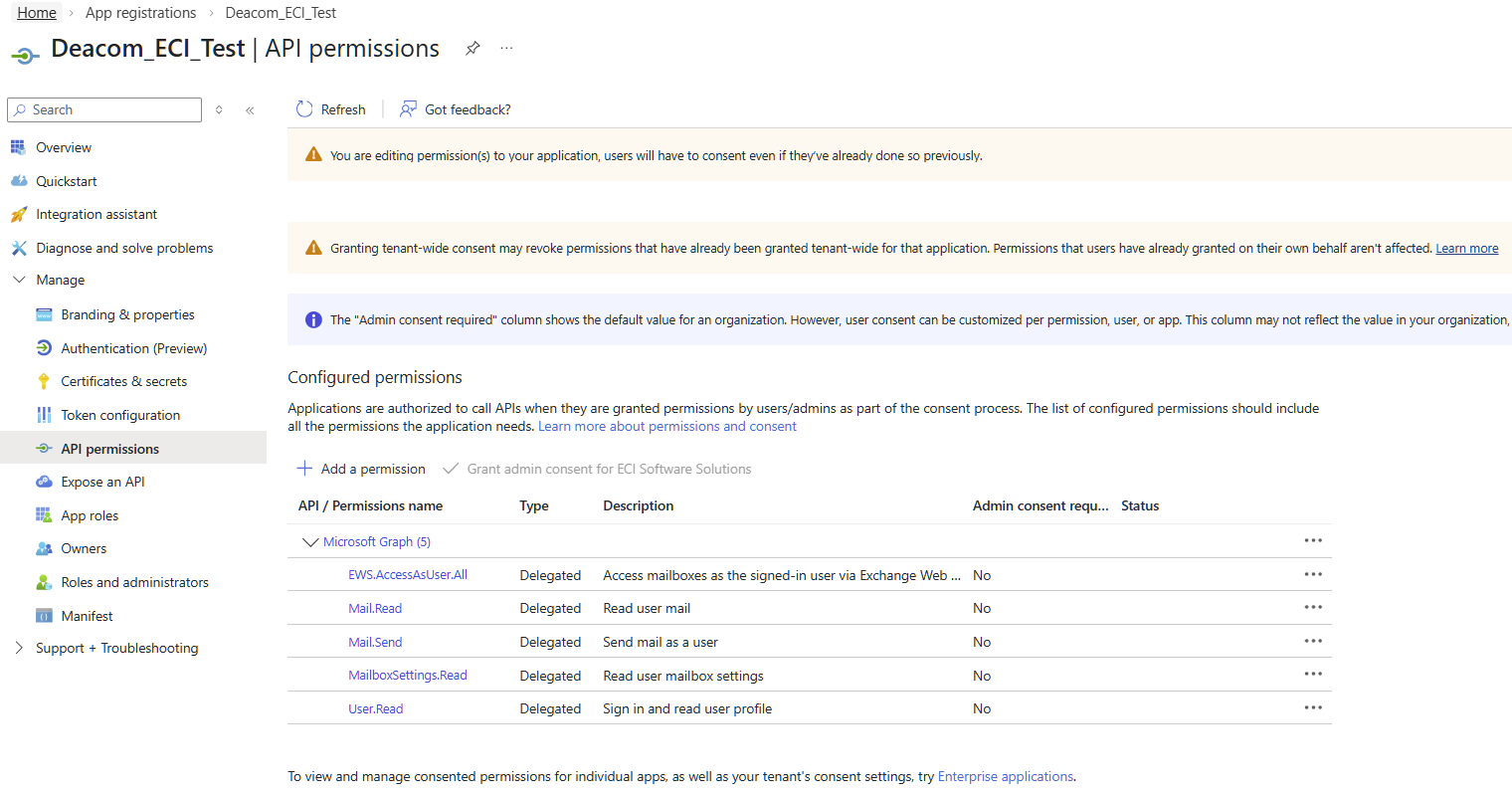 2. Setting up API Permissions. Deacom uses Microsoft Graph for OAuth2 email (not Exchange Web Services). Your Entra app must include the correct Microsoft Graph delegated (and if applicable, application) permissions for your scenario—for example, sending mail and, if you use email monitoring or related features, reading mailbox content. Exact permissions can depend on your Deacom version and which features you use; work with your implementation team or support if you are unsure. On the left hand menu (under the Manage folder/option) there is an option for API PermissionsYou can add permissions in the portal, or users may be prompted to consent the first time they send email. A common approach is to complete a test send from Deacom and accept the Microsoft permission prompt when it appears: